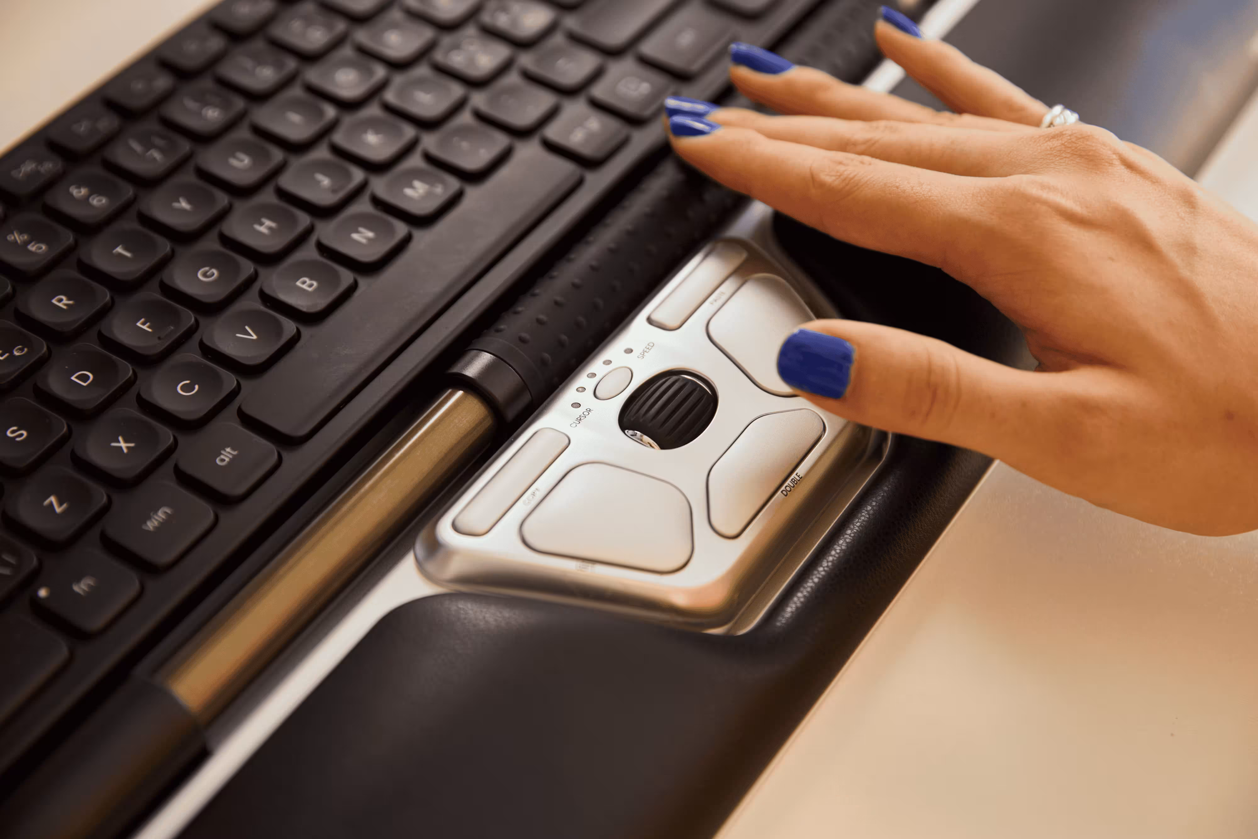 Contour’s RollerMouse is designed specifically to reduce the repeated movements and side reaching that lead to wrist and elbow strain. Positioned centrally in front of the keyboard, it keeps the user’s body aligned and supported throughout the workday.