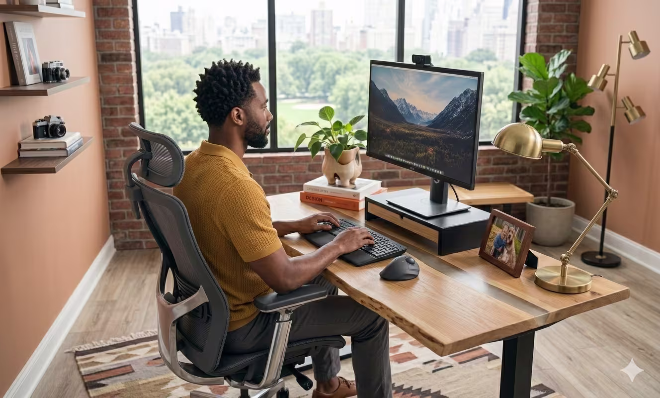 Set desk and chair so shoulders relax, elbows sit around 90–100°, and wrists stay neutral. Use the built-in wrist rest or add a soft one so you don't plant the medial elbow on the desk edge. Pair with a compact keyboard to hold the cursor in your midline.